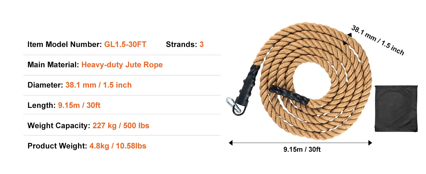 Abrasion Resistance and High Tensile Strength: Constructed from premium heavy-duty hemp rope material with a diameter up to 1.5 inch, this gym climbing rope offers strong tensile strength and abrasion resistance, capable of bearing significant weight and tension. It has undergone a 15,000N tensile strength test and supports a maximum weight of 500 pounds. It's recommended for indoor use in dry environments, avoiding moisture and water contact.