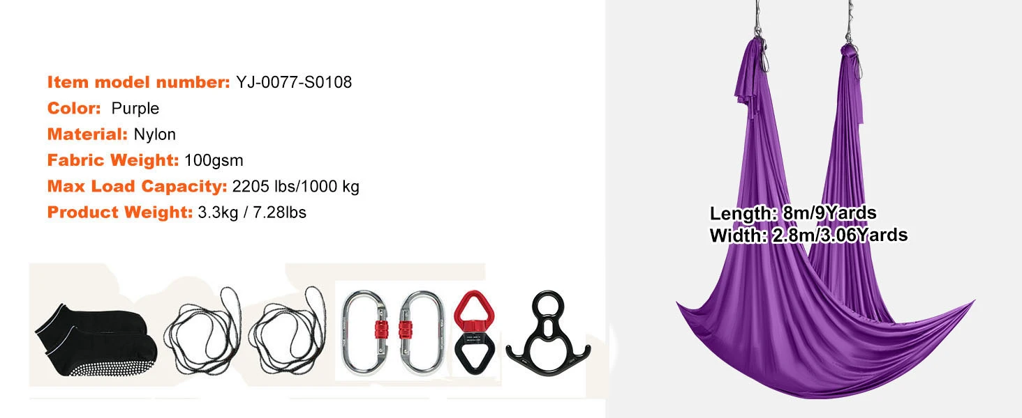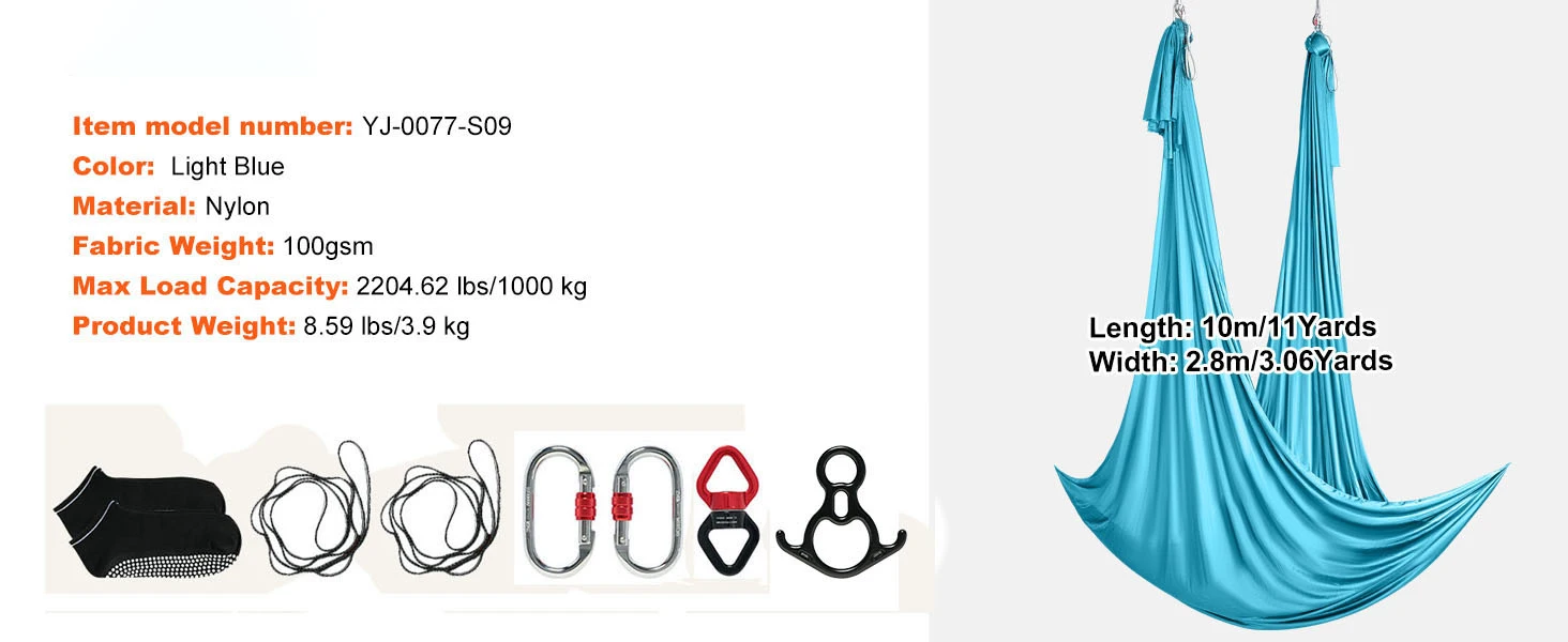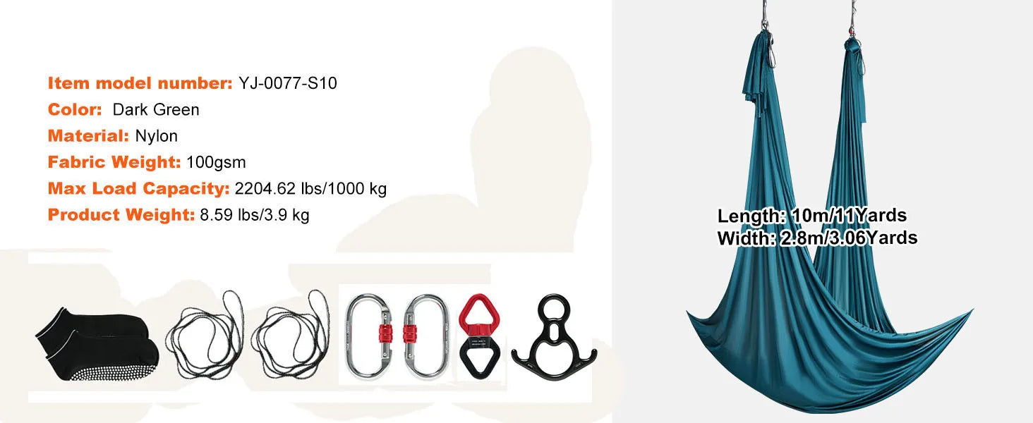 Abundant Accessories: Our yoga silk comes with a variety of accessories, transforming it into an aerial swing and expanding its versatility. Use it for diverse yoga practices and leisure activities, whether at a yoga studio, at home, or in the great outdoors.