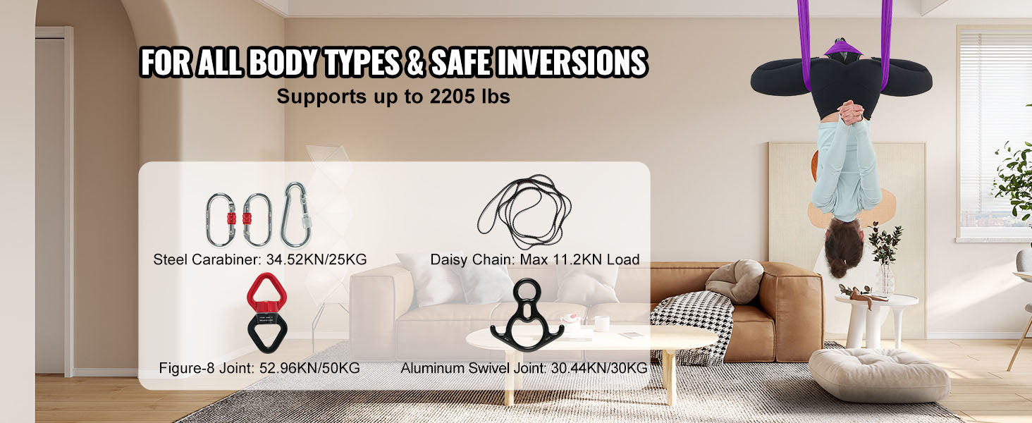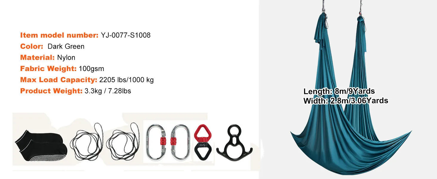 Safe Weight Capacity: With a whopping maximum weight capacity of 2204.62 lbs/1000 kg, this aerial yoga hammock ensures your security, even during advanced moves like inversions and spins. Your adventures will always be secure.